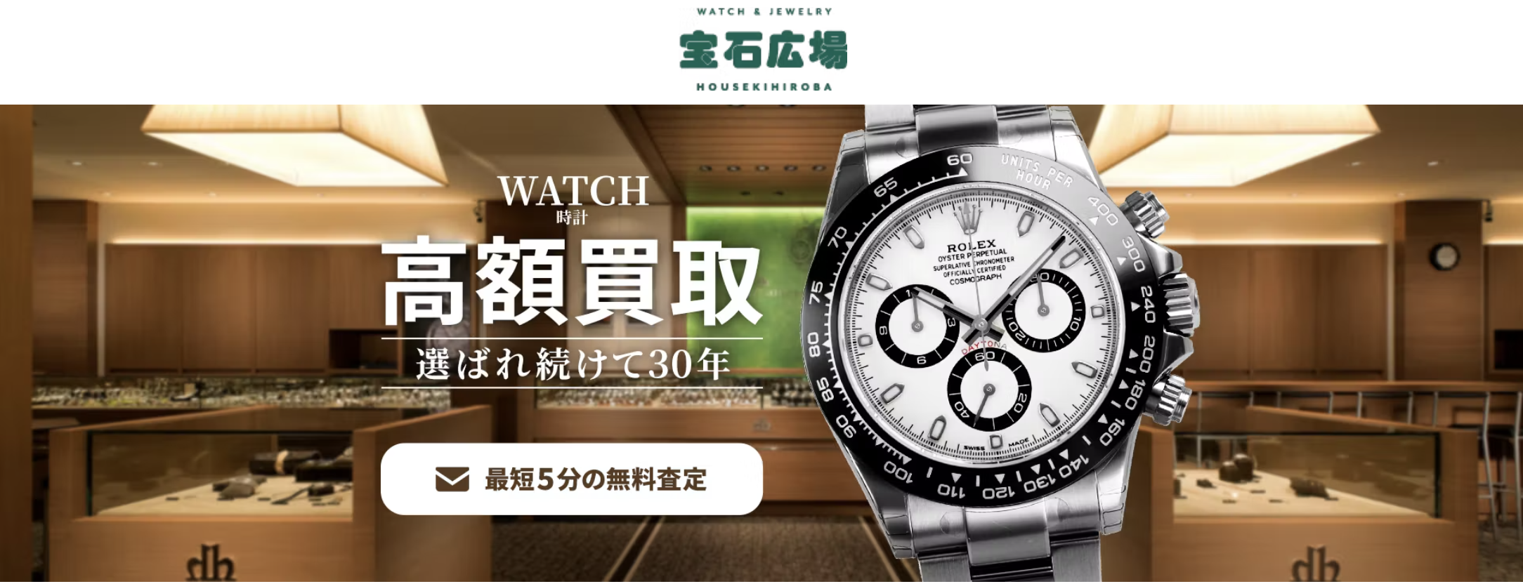 宝石広場は、渋谷に実店舗を構えて30年の実績を持つ時計&ジュエリーの専門店です。時計の販売・買取・修理を全て自社で行っている一貫体制が最大の強みであり、その分の中間コストをカットして買取金額に還元しています。