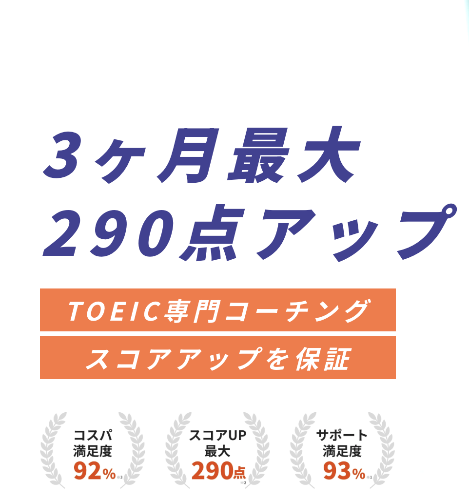 | サポート体制 | TOEIC900点超えの専属コーチとの個別レッスン、学習進捗管理、スコアUP保証 |