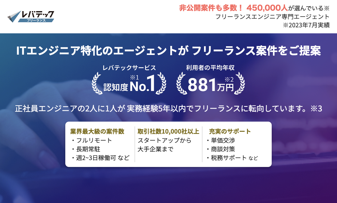 レバテックフリーランスは、レバテック株式会社が運営する日本最大級のフリーランスエンジニア・デザイナー向け案件紹介サービスです。累計登録者数は45万人を超え、フリーランスエージェント業界において「認知度No.1」「利用満足度No.1」の地位を不動のものにしています。