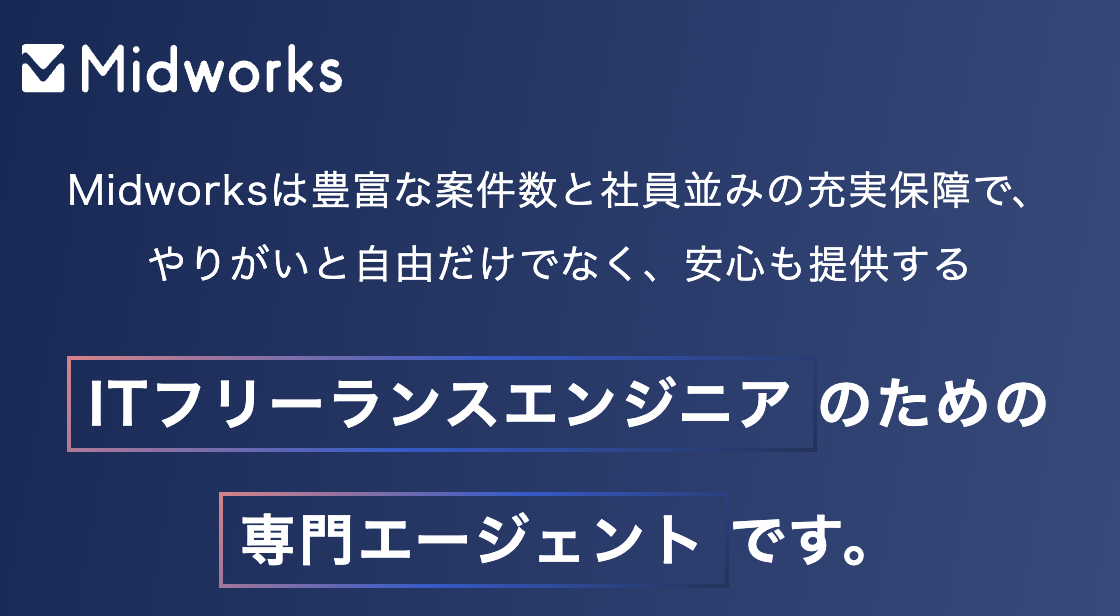Midworksは、株式会社Branding Engineerが提供する、フリーランスエンジニアのための案件・求人サイトです。そのコンセプトは「フリーランスの自由度と、正社員の安定感」の両立です。