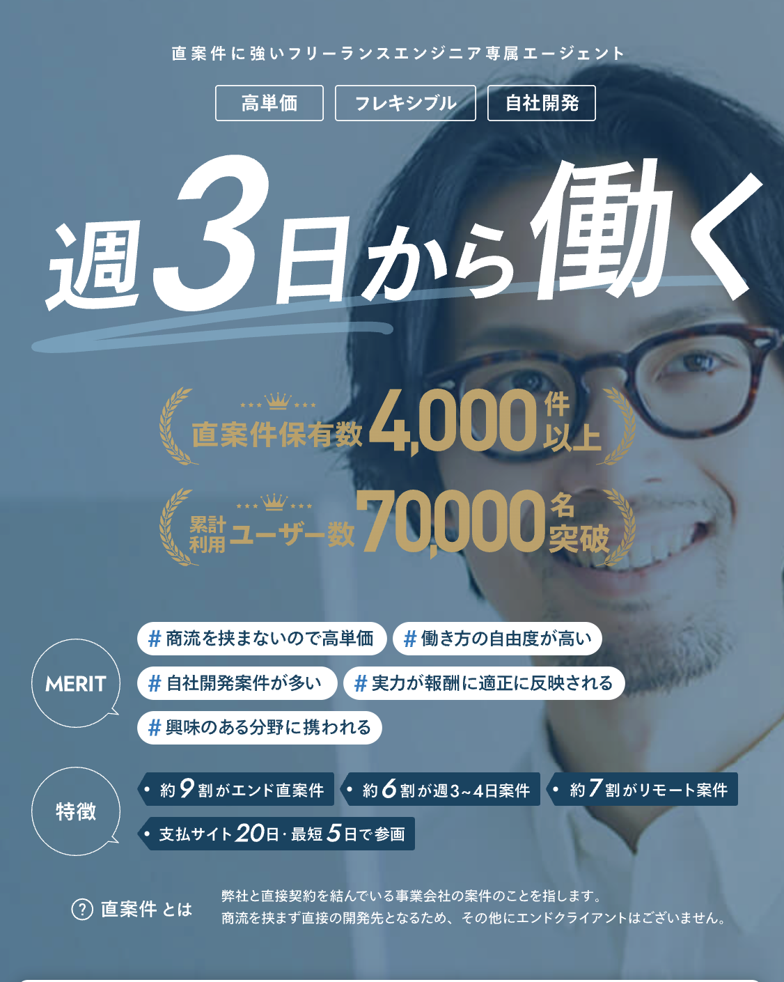 「エンド直請け(1次請け)」なのか「2次請け・3次請け」なのかは非常に重要です。商流が深くなるほどマージンが抜かれ、あなたの手取りは減り、責任範囲も曖昧になります。レバテックフリーランスのように「直請け」を明言しているサービスを選びましょう。