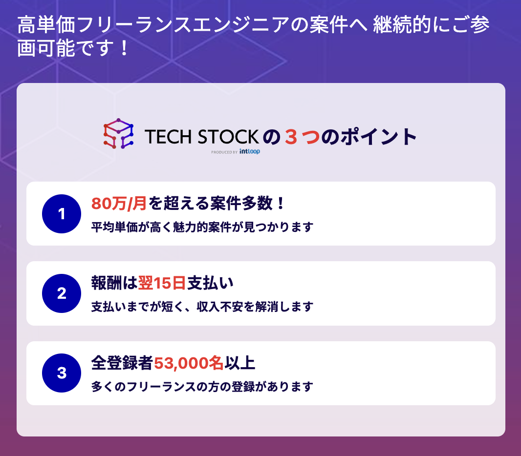 TechStockは、東証グロース上場企業のINTLOOP株式会社が運営する、ハイエンド層向けのフリーランスエージェントです。同社はコンサルティング事業も手掛けているため、他社にはない「上流工程」や「PM/PMO」案件に非常に強いのが特徴です。