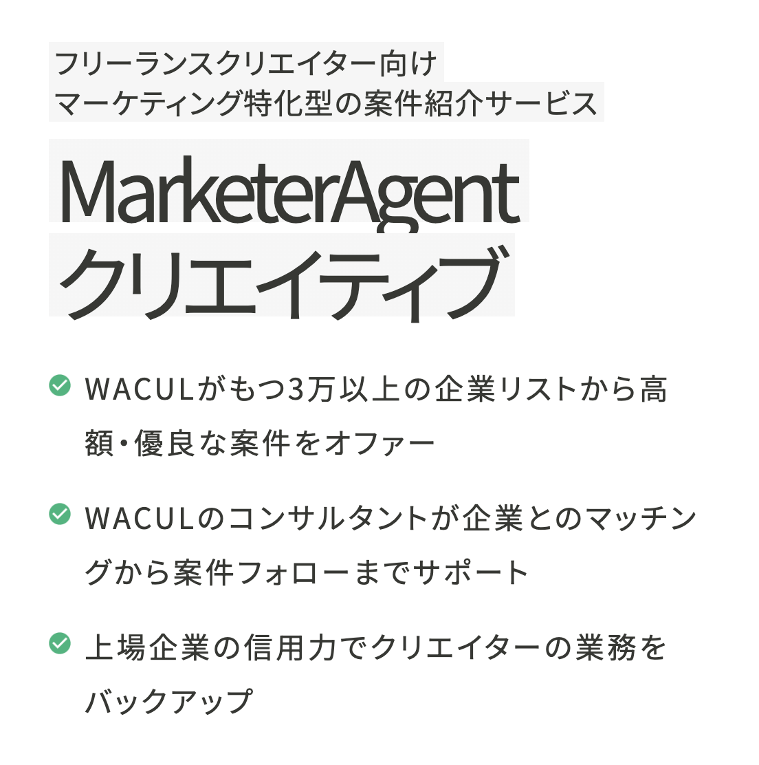 デジタルマーケティングのコンサルティングを行う株式会社WACULが運営するエージェントです。母体がマーケティング会社であるため、紹介される案件も「LPのCVR改善」や「広告クリエイティブの制作」など、数字や成果にコミットする質の高い案件が多いのが特徴です。