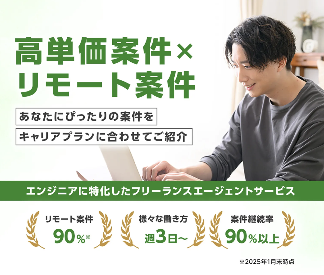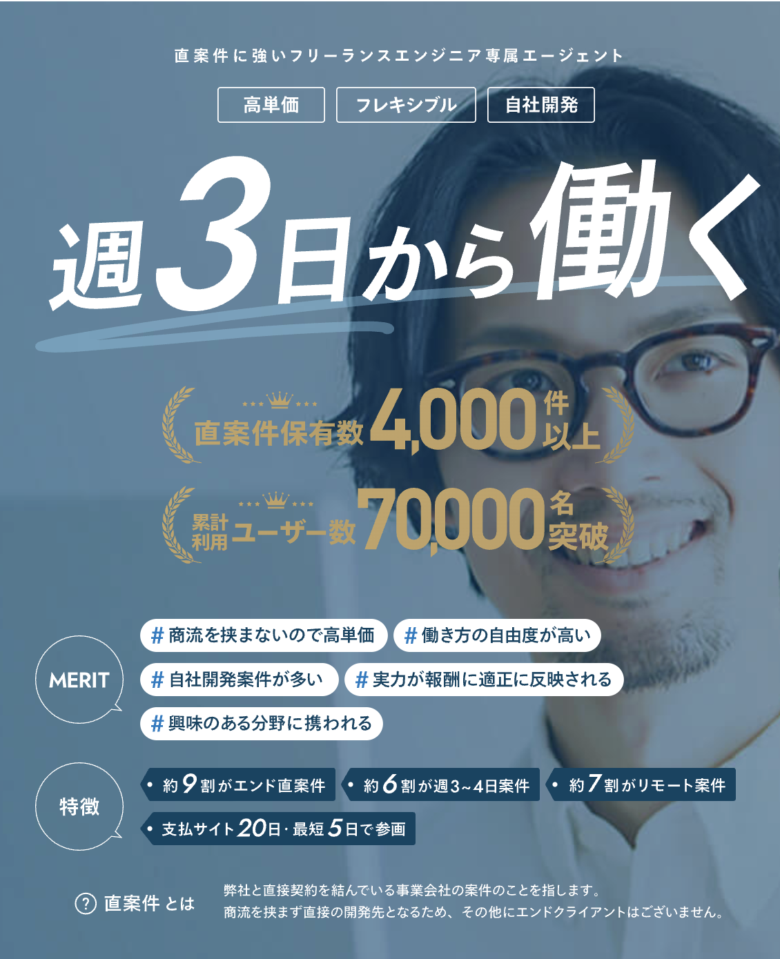- エンド直請けへのこだわり: 仲介会社を挟まない直請け案件にこだわっており、週3日稼働でも週5日稼働並みの月収を得られるような高単価案件が見つかります。