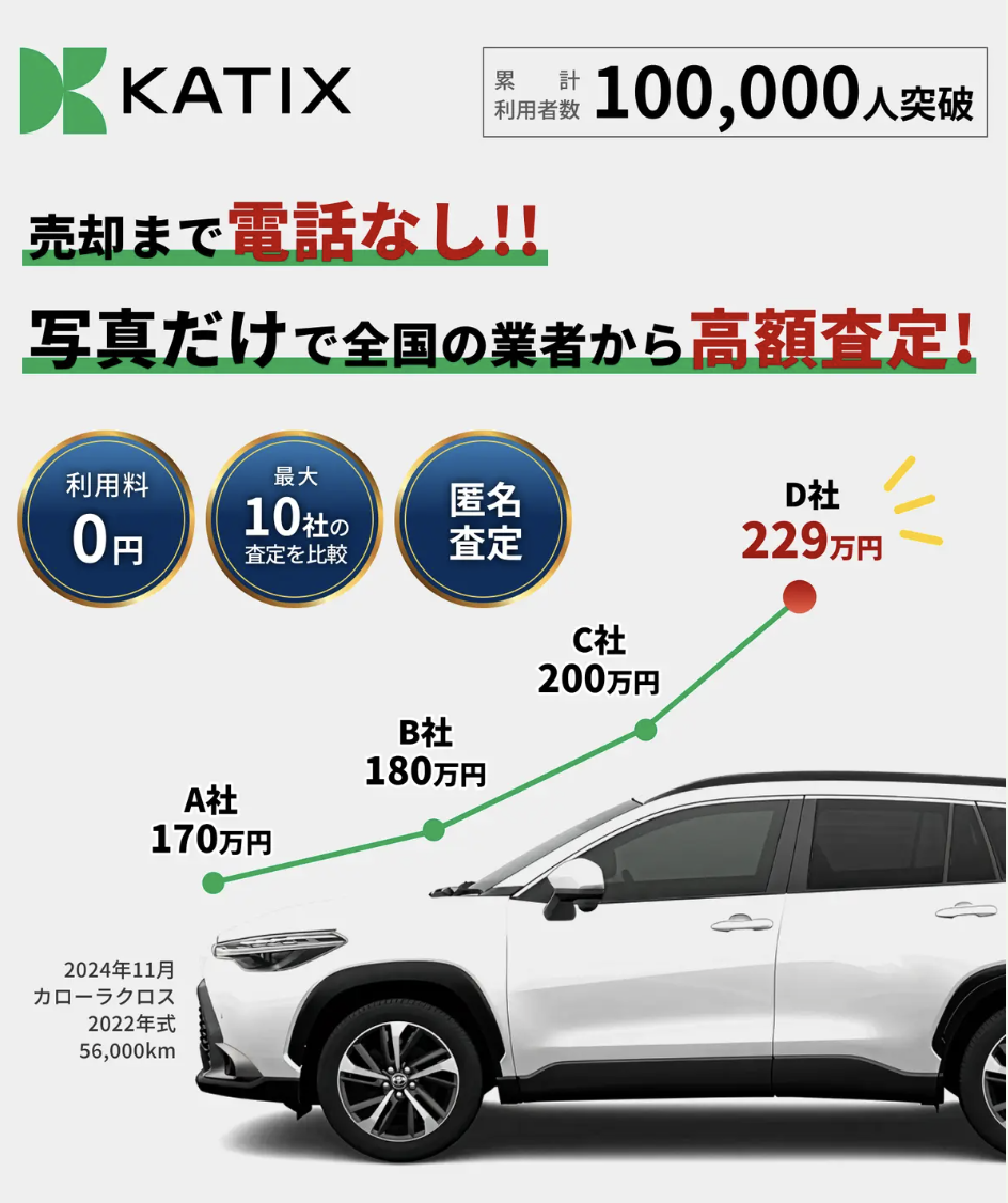カチエックス 完全無料(0円) 写真だけで最大10社が査定。実車査定なし・現地での減額交渉なし。