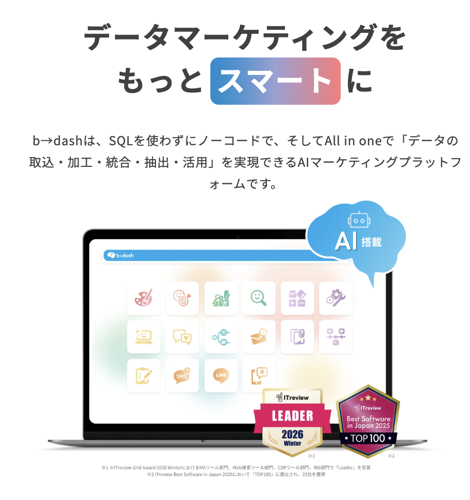 b→dash(ビーダッシュ)は、データの取得・統合から、BI(可視化)・MA(メール配信、LINE、Web接客など)による施策実行まで、マーケティングに必要なあらゆる機能を1つのプラットフォームで網羅したデータマーケティングクラウドです。最大の特徴である「データパレット」機能により、エンジニアに依頼せずともマーケター自身の手で直感的に複数テーブルのデータ統合・加工を行えるため、高速な施策展開が可能になります。