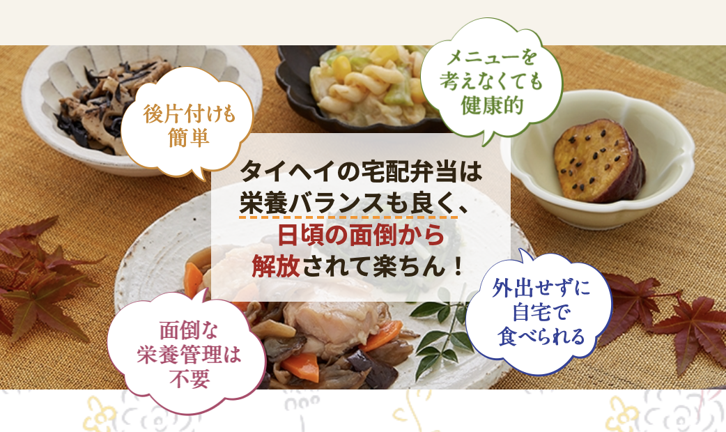- 「タイヘイ」は定期購入で送料無料となり、管理栄養士のサポートも無料で付くため、トータルコストで考えると非常に経済的です。ヘルシー御膳は7食セット税込5,480円です。