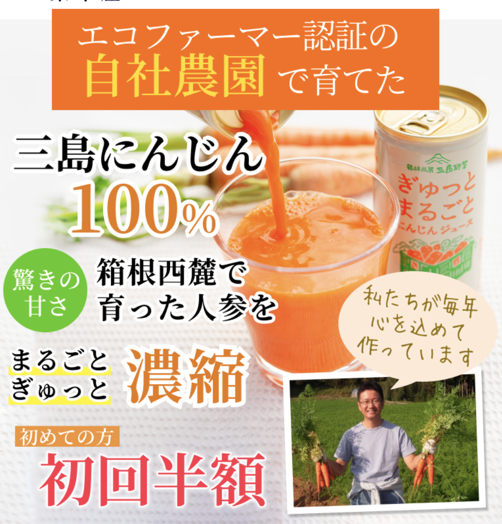 最大の特徴は、標高50m以上の厳しい寒さで育った三島人参の驚くほどの甘さです。一般的な人参とは糖度が違い、生でかじっても甘い品種をジュース用に厳選。さらに搾汁だけでなくペースト加工したものを加えることで、濃厚で贅沢な味わいを実現しています(1缶に約3本の人参を使用)。