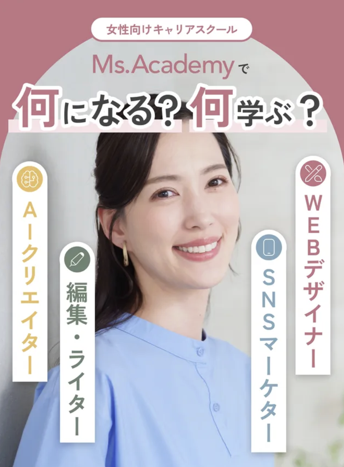【Ms.Academyの特徴】 第3位は、女性のキャリア支援に特化した『Ms.Academy』です。 「結婚・出産後も自分らしく働きたい」という女性の願いを叶えるために設計されたスクールで、Webデザイナー、SNSマーケター、AIクリエイター、編集ライターの4職種から、自分に合ったスキルを選んで学ぶことができます。